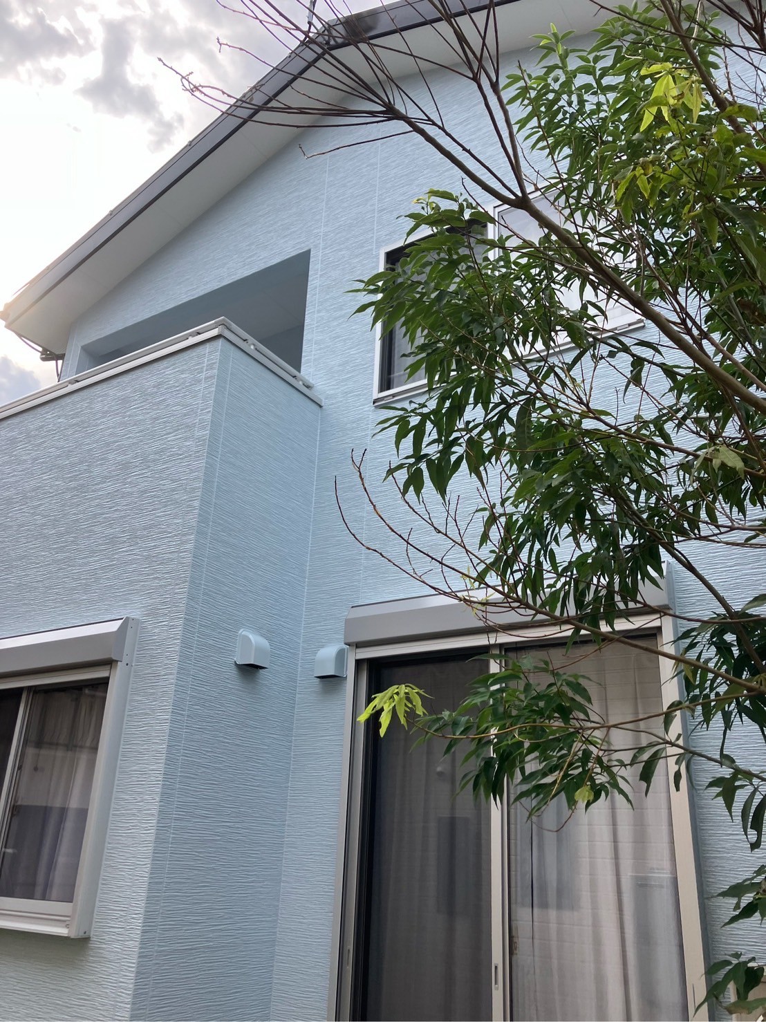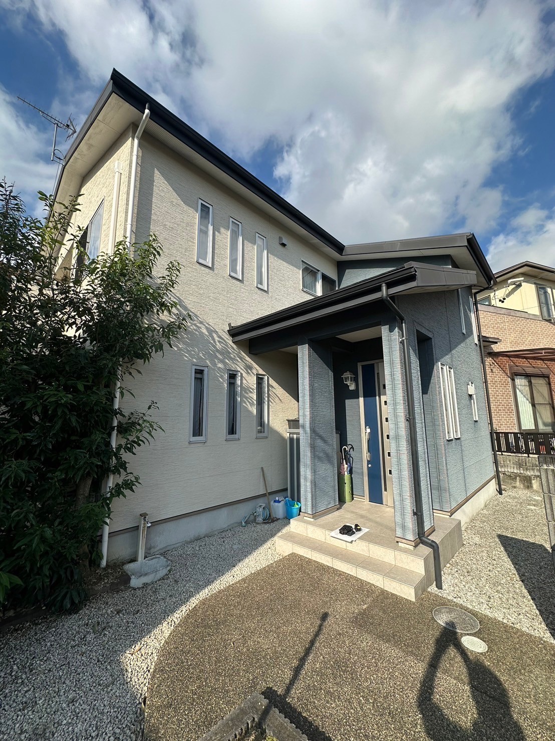 玄関周りの濃い青が大分、色褪せしており、